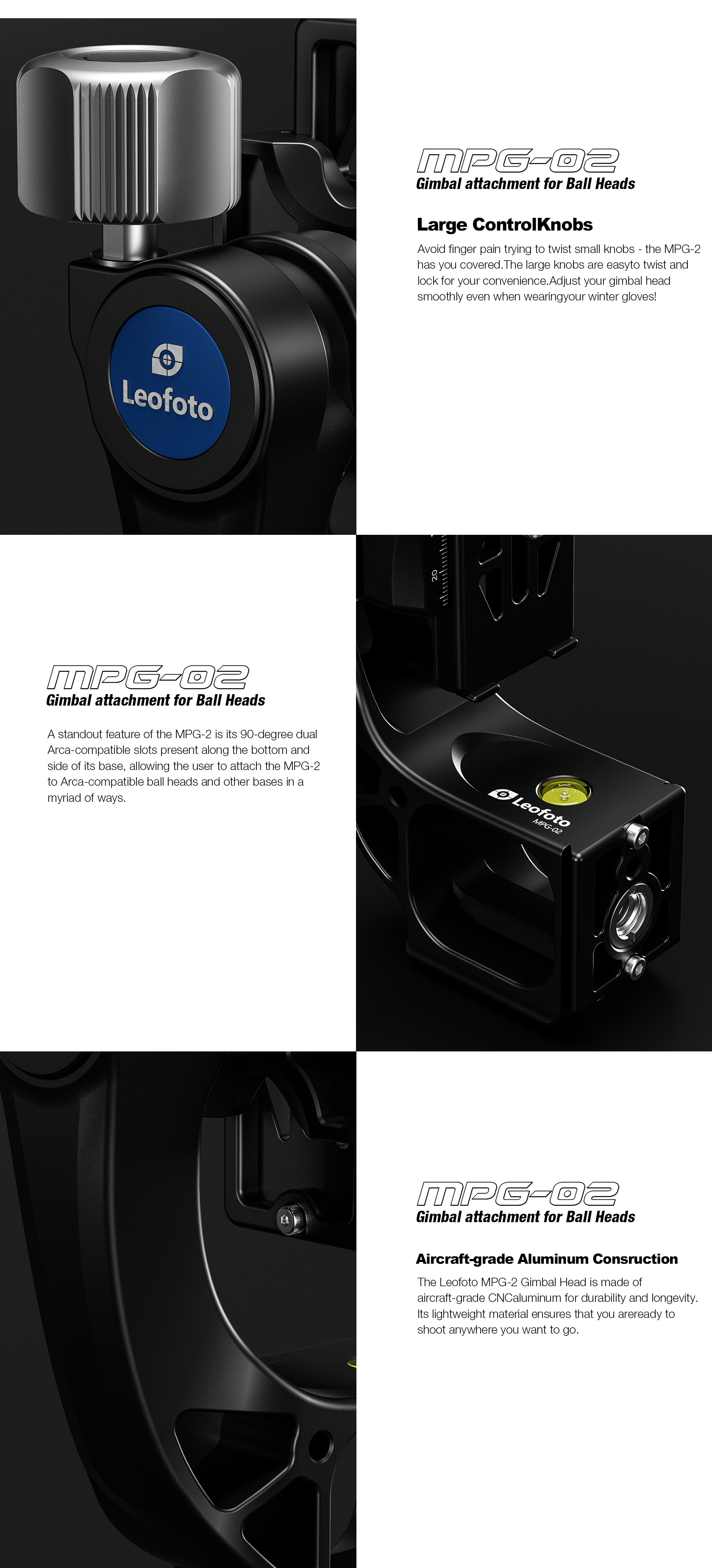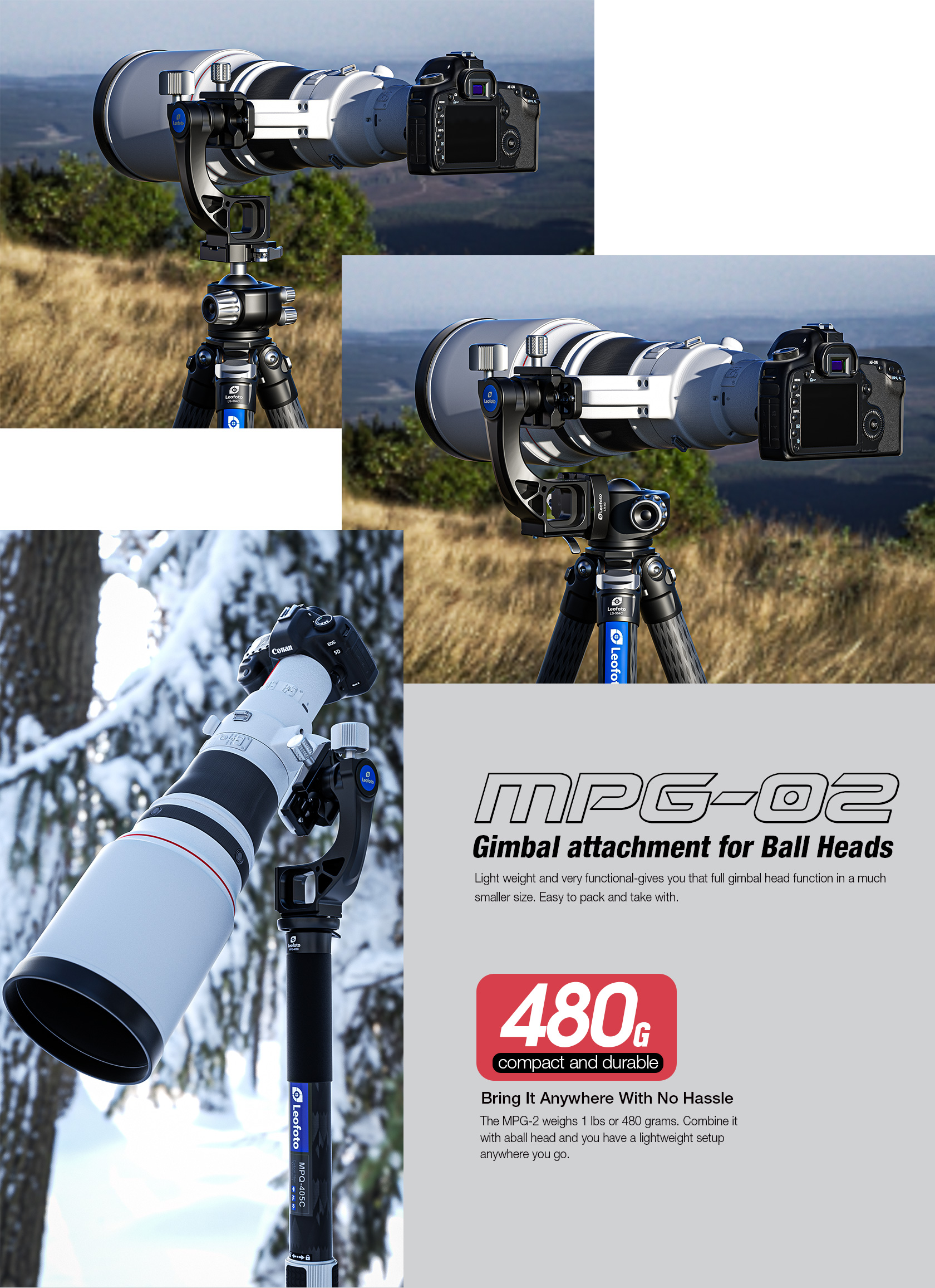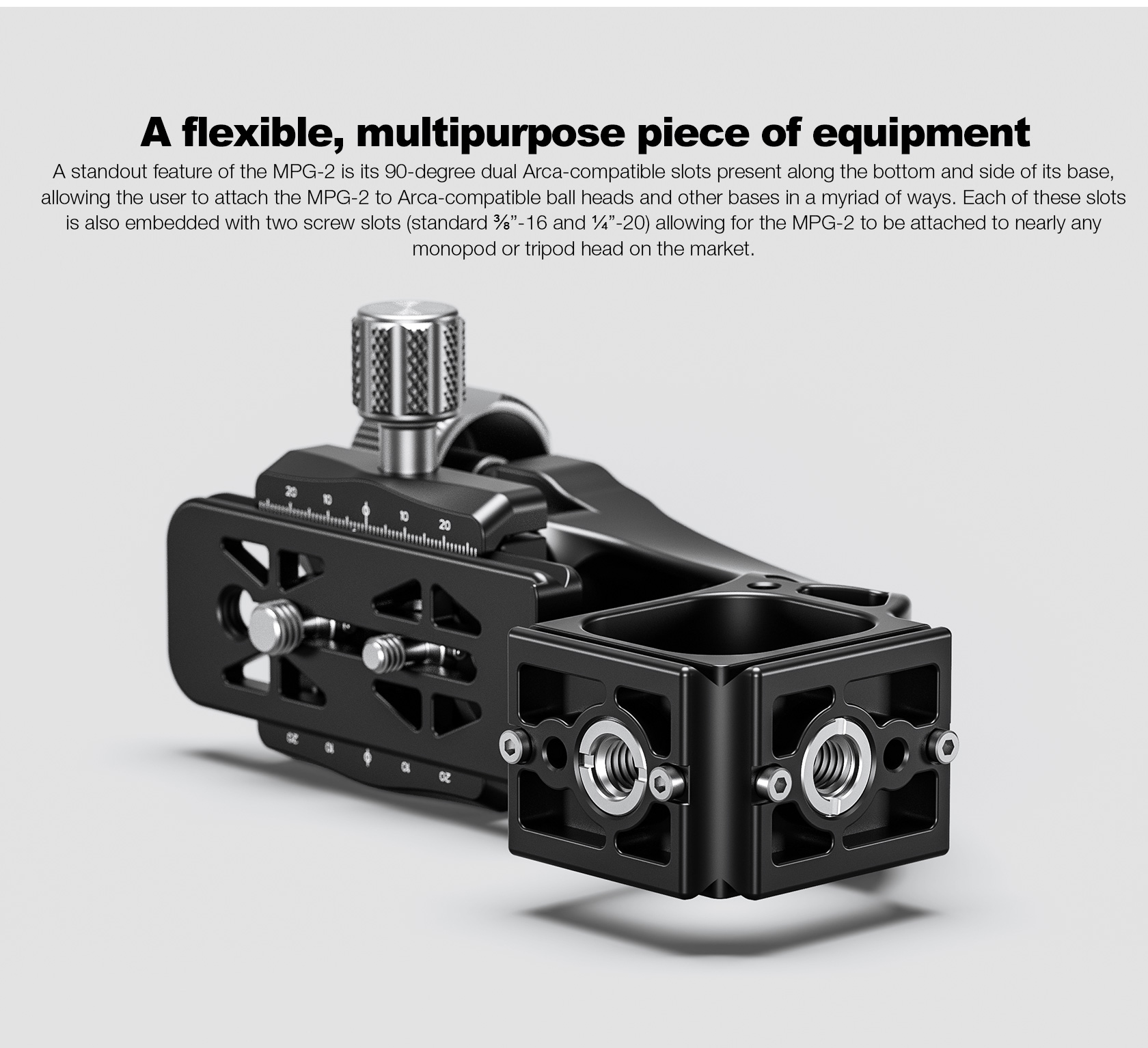 The MPG-02 Gimbal Attachment for Tripod Heads is a highly portable support solution for photographers who need the functionality of a gimbal head but want to save space and weight or add customizability, to their setup when traveling. When mounted to ball and other standard-style heads, this attachment creates a raised, angled mounting point for your camera which can be especially helpful when shooting with long telephoto lenses. The attachment has two Arca-type compatible bases at a 90° angle, both with 3/8"-16 and 1/4"-20 threaded holes for wide compatibility, which allow you to always find the right angle for your shot.